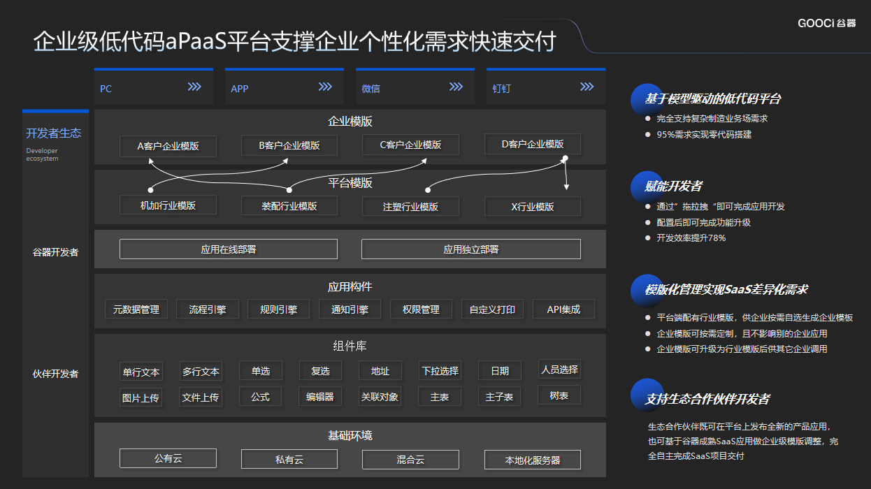 作為國(guó)內(nèi)第 一、通過SaaS+低代碼開發(fā)的企業(yè)數(shù)字化轉(zhuǎn)型解決方案服務(wù)商,谷器數(shù)據(jù)在促進(jìn)低代碼開發(fā)平臺(tái)在制造領(lǐng)域規(guī)?;瘧?yīng)用的方向毅力前行,上線低代碼開發(fā)平臺(tái),使得業(yè)務(wù)人員通過低代碼平臺(tái)配備頁面編輯器上的元素、樣式、組件自由編輯頁面,按需搭建個(gè)性化數(shù)字化應(yīng)用,滿足業(yè)務(wù)需求。另外,谷器低代碼開發(fā)平臺(tái)提供海量的行業(yè)組件庫,僅需通過組件配置的方式,在方便應(yīng)用開發(fā)的同時(shí),構(gòu)建組件開發(fā)者生態(tài),持續(xù)豐富組件庫,保持應(yīng)用具備強(qiáng)擴(kuò)展性、延續(xù)性,持續(xù)滿足企業(yè)數(shù)字化升級(jí)需求,并為行業(yè)提供成熟模板,加速產(chǎn)業(yè)數(shù)字化轉(zhuǎn)型步伐。