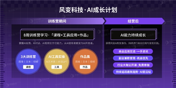 利用碎片化時(shí)間系統(tǒng)性學(xué)習(xí)AI能力,風(fēng)變AI成長計(jì)劃以輸出結(jié)果為導(dǎo)向、按周為單位,建立了完善的AI課程培養(yǎng)體系。幫助用戶從AI使?者蛻變?yōu)锳I開發(fā)者,風(fēng)變AI成長計(jì)劃開設(shè)的AI繪圖、AI對話、AI視頻三大訓(xùn)練營,以圖像、文本、視頻等多元化課程表現(xiàn)形式為用戶灌輸知識點(diǎn)。如AI繪圖訓(xùn)練營的四周課程中依次對用戶展開繪圖基本功訓(xùn)練、繪圖專業(yè)創(chuàng)作、商業(yè)應(yīng)用初階、商業(yè)應(yīng)用進(jìn)階的專項(xiàng)訓(xùn)練,輸出自己的專屬作品集,用戶將從新手逐步進(jìn)化成為具備專業(yè)能力的設(shè)計(jì)師,最終完成個(gè)人價(jià)值的商業(yè)變現(xiàn)。