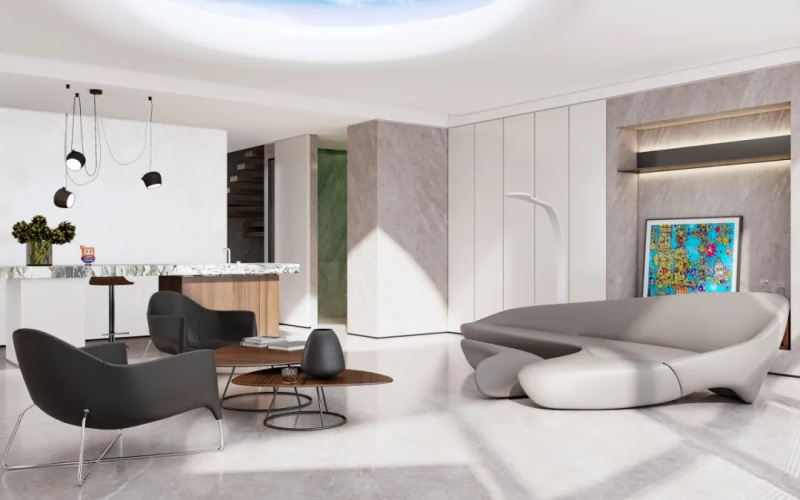 ▲冠珠華珍巖板大宅設(shè)計(jì)案例鑒賞——【客廳地面:滄浪灰】