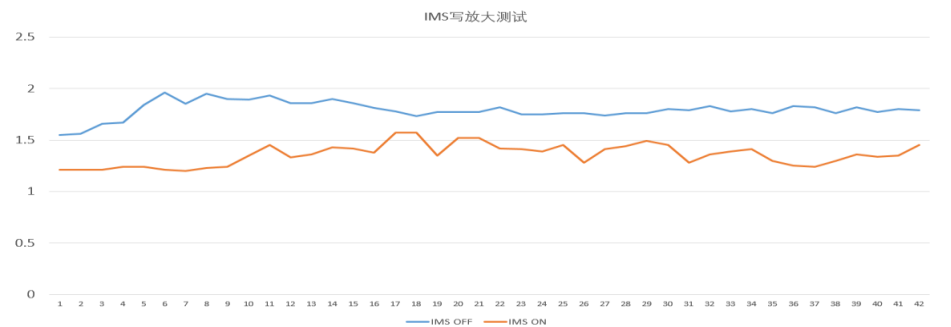 在 Ceph 方案中,基于標(biāo)準(zhǔn) JESD 219 業(yè)務(wù)模型,針對(duì) SSD 分別開(kāi)啟、關(guān)閉智能多流進(jìn)行寫放大測(cè)試,通過(guò)圖 7 對(duì)比驗(yàn)證結(jié)果可以看到憶聯(lián)智能多流(IMS)開(kāi)啟后,SSD 寫放大降低 20%+,極大提升了 SSD 壽命。