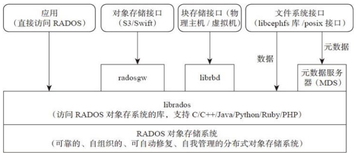 Ceph 主要分為應(yīng)用接口層、存儲(chǔ)基礎(chǔ)接口層、存儲(chǔ)對(duì)象層。接口層主要負(fù)責(zé)客戶端訪問(wèn),分為本地語(yǔ)言綁定接口、塊存儲(chǔ)設(shè)備接口和文件系統(tǒng)接口,展現(xiàn)了 Ceph 統(tǒng)一性。