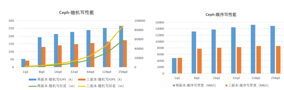 如圖 5 所示,不論是在隨機(jī)寫還是在順序?qū)憳I(yè)務(wù)下,二副本寫性能遠(yuǎn)高于三副本性能,主要是由于副本復(fù)制帶來(lái)的網(wǎng)絡(luò)及存儲(chǔ)開(kāi)銷,造成三副本寫帶寬及寫 IOPS 下降明顯。在總體時(shí)延表現(xiàn)上,二副本明顯優(yōu)于三副本。在時(shí)延變化趨勢(shì)上,二副本與三副本基本一致,皆在 32QD 后有比較顯著的上升。