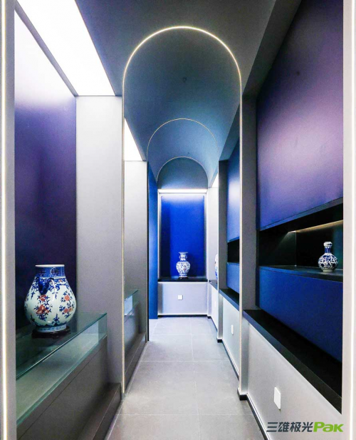 博物館長廊運(yùn)用線性照明強(qiáng)調(diào)空間縱深感,搭配智能控制方式,在長廊內(nèi)逐一點(diǎn)亮展品,使其成為“吸睛點(diǎn)”,令大家自然而然地進(jìn)入觀展氛圍。