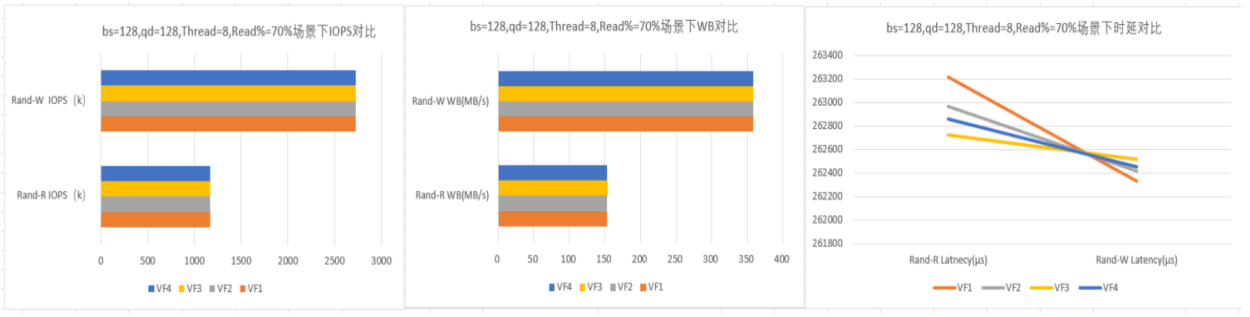 本次在 SR-IOV 功能下的不同 VF 場景下總性能與整盤的性能對比圖如下(以下數(shù)據(jù)為此次驗證數(shù)據(jù),僅供參考)。
