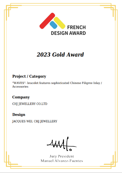 全球設(shè)計領(lǐng)域最具影響力的獎項“法國設(shè)計獎(FDA)”、“美國繆斯設(shè)計獎(MUSE)”于近期公布2023年獲獎榜單,潮宏基珠寶與設(shè)計師Jacques Wei聯(lián)名WAVES浪潮系列花絲手鐲經(jīng)過重重遴選,于全球眾多參賽作品中脫穎而出,憑借獨特且極具張力的設(shè)計接連在兩項國際設(shè)計獎項評選中斬獲金獎。