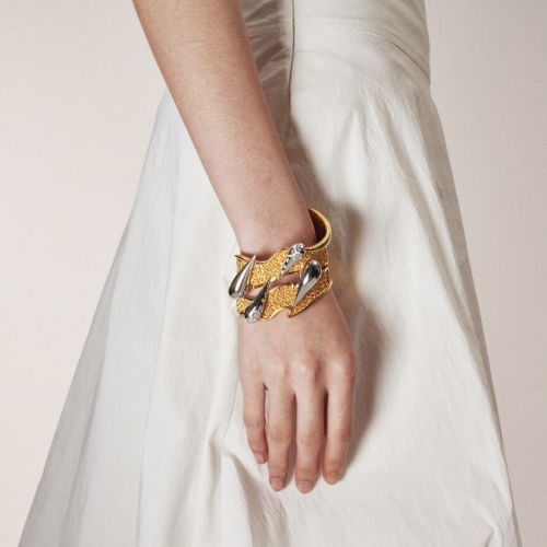 潮宏基 X Jacques Wei聯(lián)名WAVES浪潮系列花絲手鐲,設(shè)計靈感來源于海洋力量與傳統(tǒng)金銀花絲鑲嵌工藝,摒棄單一形象的演繹,突破傳統(tǒng)非遺花絲工藝的紋路排布規(guī)律,用花絲編織紋理結(jié)合自然神秘浪潮意象,在傳統(tǒng)工藝中融合了不同材質(zhì)與編織鑲嵌技法,以點線面堆疊呈現(xiàn)出首飾的光澤感和厚重。神秘深邃,無盡廣袤,海水卷起金銀線,凝結(jié)成絲,觀者仿佛能聽到海浪擊礁石的聲音。