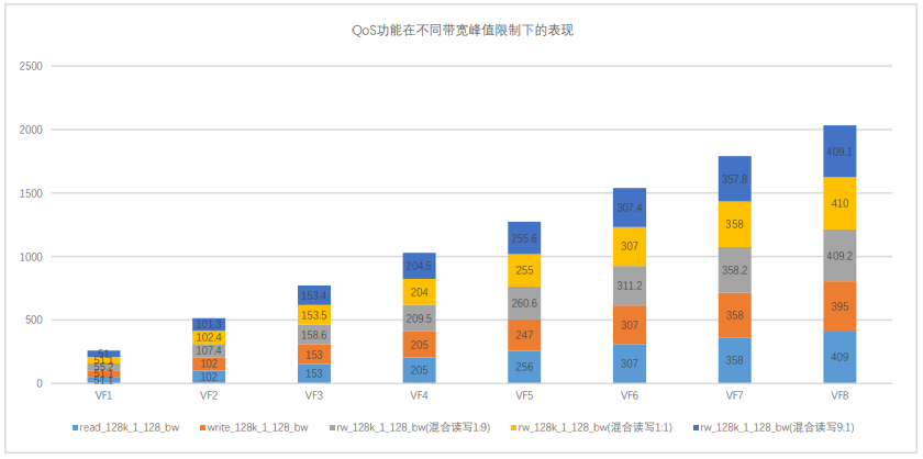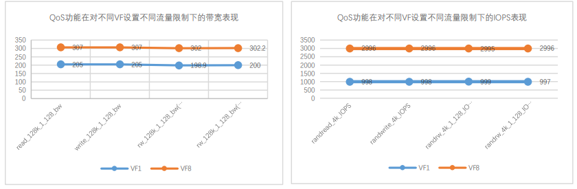圖 2:QoS 功能在對不同 VF 設置不同流量限制下的帶寬及 IOPS 表現(xiàn)