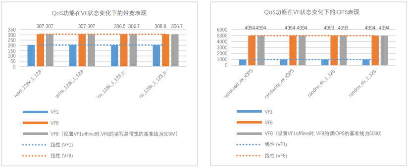 圖 3: QoS 功能在 VF 狀態(tài)變化下的帶寬及 IOPS 表現(xiàn)