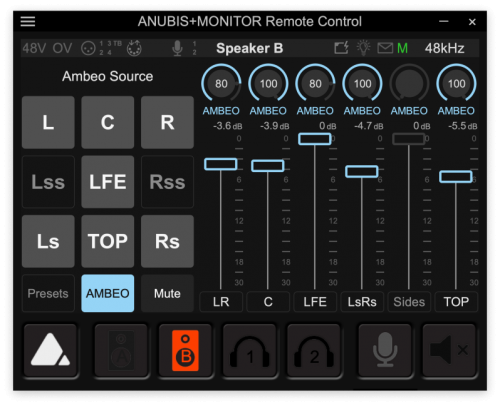 ![]() | AMBEO雙聲道空間音頻實(shí)時(shí)渲染器讓所有觀眾都能領(lǐng)略環(huán)繞聲和沉浸式內(nèi)容的魅力。圖中所示為用于微調(diào)空間增強(qiáng)型雙聲道混音的渲染器界面原型機(jī),用戶可通過標(biāo)準(zhǔn)Anubis遠(yuǎn)程遙控軟件進(jìn)行控制 |