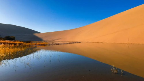 伴隨著前行的腳步,尋跡考察團來到了“沙漠第 一泉”鳴沙山月牙泉。水質甘冽,澄清如鏡,綿歷古今,沙不進泉,水不濁涸。鐵魚鼓浪,星草含芒,水靜印月,薈萃一方,故稱“月泉曉澈”。