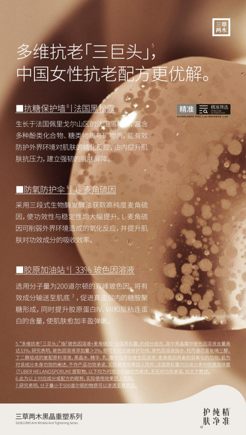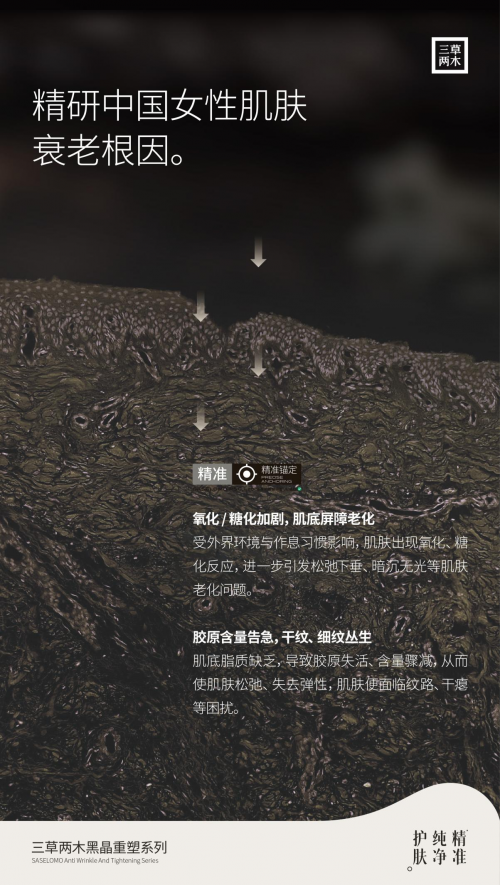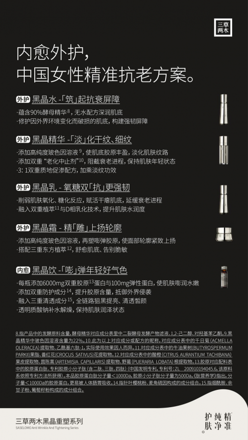 在對多維抗老成分深入研究的基礎(chǔ)上,三草兩木打造黑晶水、黑晶乳、黑晶霜、黑晶飲產(chǎn)品矩陣,搭建更適合中國人的全鏈路精準抗老方案。三草兩木黑晶水含有90%的酵母精華,無水配方深度滋潤肌底,修護、強韌肌膚雙管齊下;三草兩木黑晶精華添加了高純度玻色因溶液,豐盈肌底、膠原、淡化干紋細紋,使肌膚保持年輕狀態(tài);三草兩木黑晶乳削弱肌膚的氧化和糖化反應(yīng),為干癟肌底注入膠原蛋白,延緩衰老進程;三草兩木黑晶霜明晰輪廓線,精「雕」不跨臉,添加33%雙峰玻色因,促進膠原蛋白生成、甄稀天然抗氧化劑99%高純度麥角硫因、甄選法國“黑鉆松露”以精純能量造就肌膚非凡自愈力。