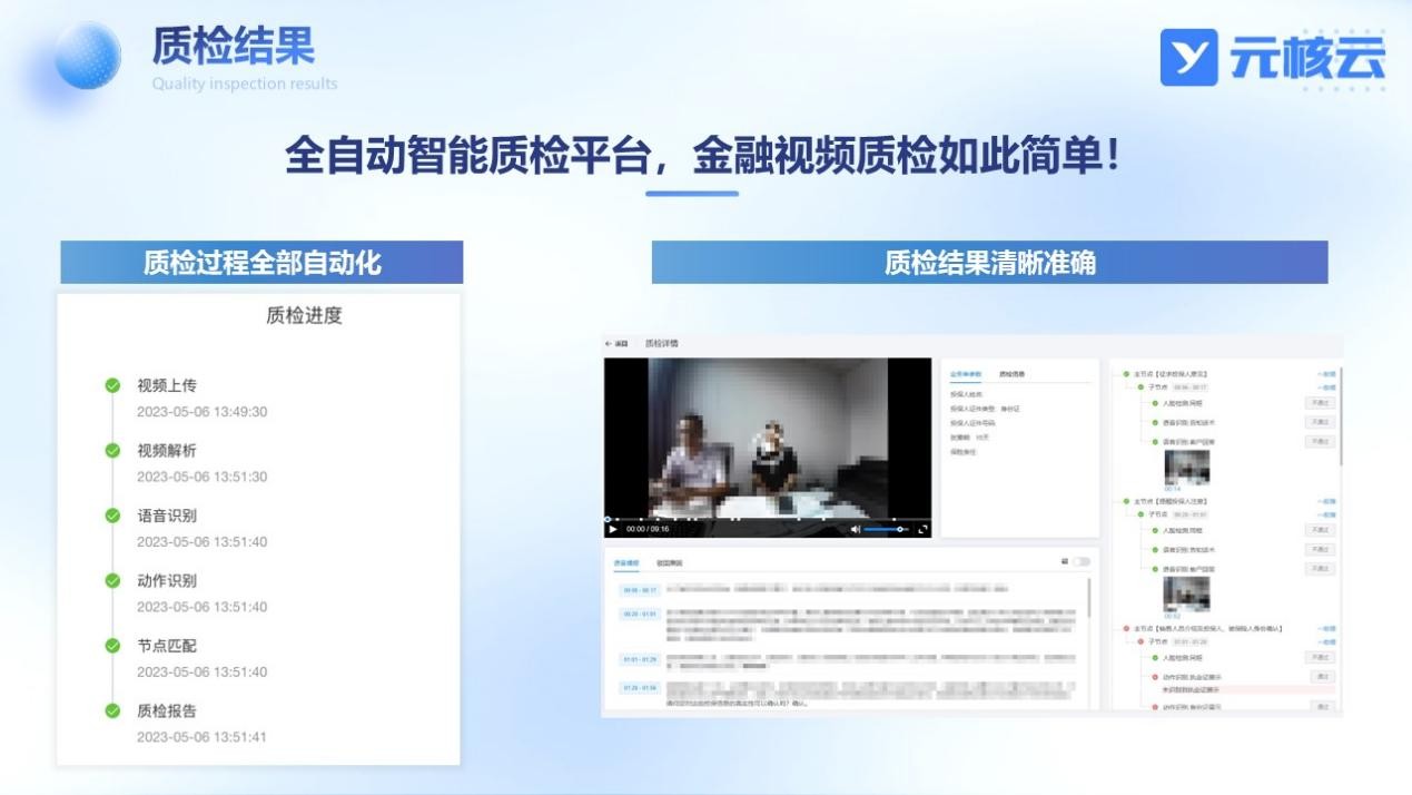 在AI技術(shù)和智能視頻分析技術(shù)的支持下,智能質(zhì)檢可以結(jié)合新質(zhì)檢要求和標(biāo)準(zhǔn)建立業(yè)務(wù)模型并設(shè)立統(tǒng)一規(guī)范的質(zhì)檢規(guī)則,全面覆蓋質(zhì)檢點(diǎn),對(duì)所有視頻資料進(jìn)行100%全量質(zhì)檢,有效規(guī)避人為判斷失誤、漏檢等情況的發(fā)生,經(jīng)測(cè)試,元核云智能質(zhì)檢準(zhǔn)確率超過(guò)98%,高精準(zhǔn)全方位地為金融業(yè)務(wù)合規(guī)發(fā)展保駕護(hù)航。