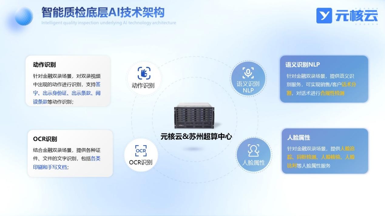 元核云依托AI技術(shù)打破人工質(zhì)檢桎梏,并與蘇州超算中心深度合作,結(jié)合金融業(yè)務(wù)場(chǎng)景進(jìn)行深度訓(xùn)練,提供了動(dòng)作識(shí)別、語(yǔ)義識(shí)別、OCR識(shí)別和人臉屬性等AI服務(wù),與音視頻技術(shù)高度融合,為金融視頻質(zhì)檢業(yè)務(wù)打造更智能、更便捷、更高效的解決方案。
