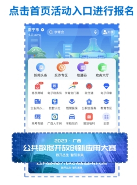 請(qǐng)使用手機(jī)“智桂通”APP點(diǎn)擊“2023年廣西公共數(shù)據(jù)開放創(chuàng)新應(yīng)用大賽”跳轉(zhuǎn)進(jìn)入。