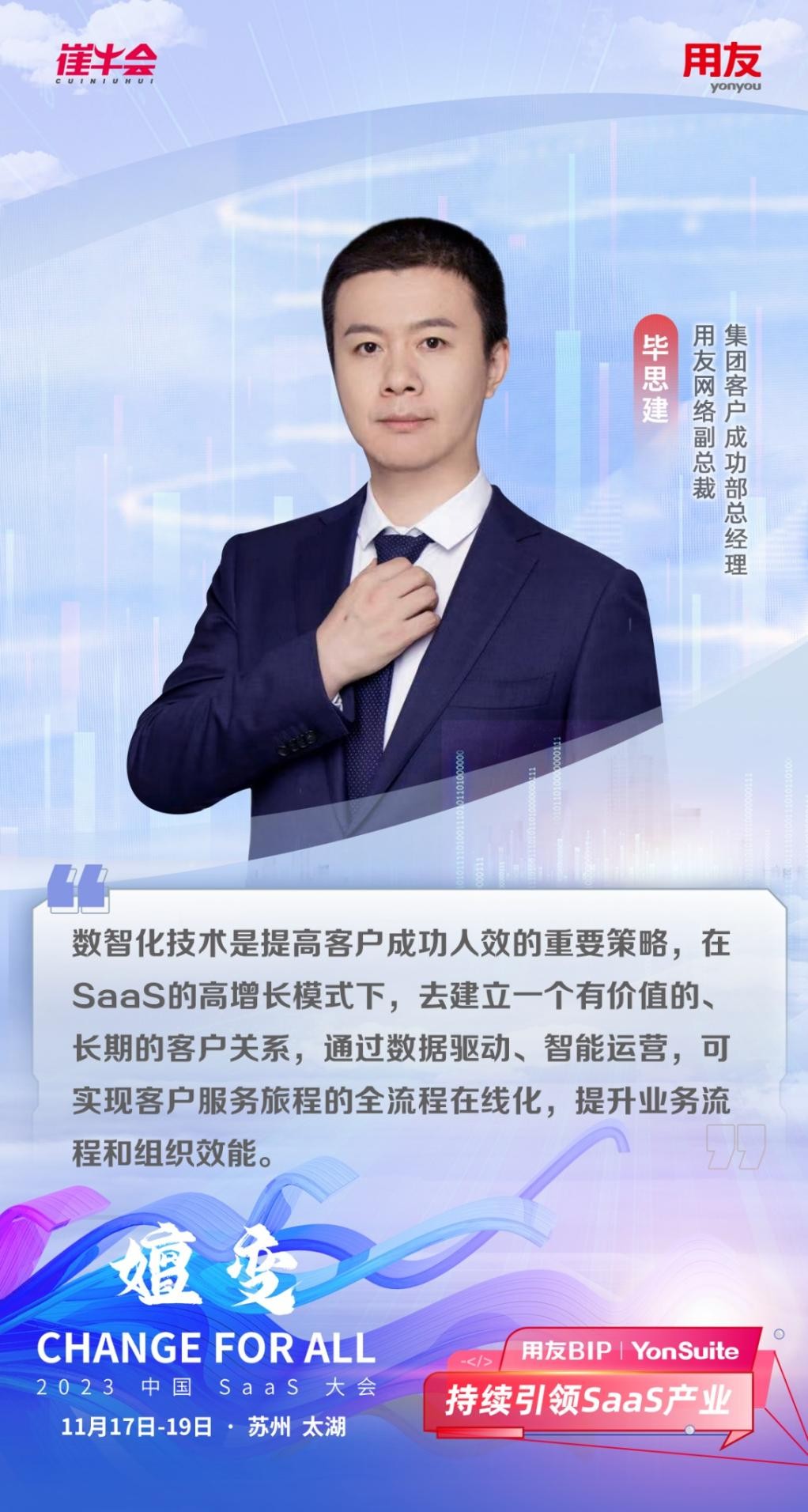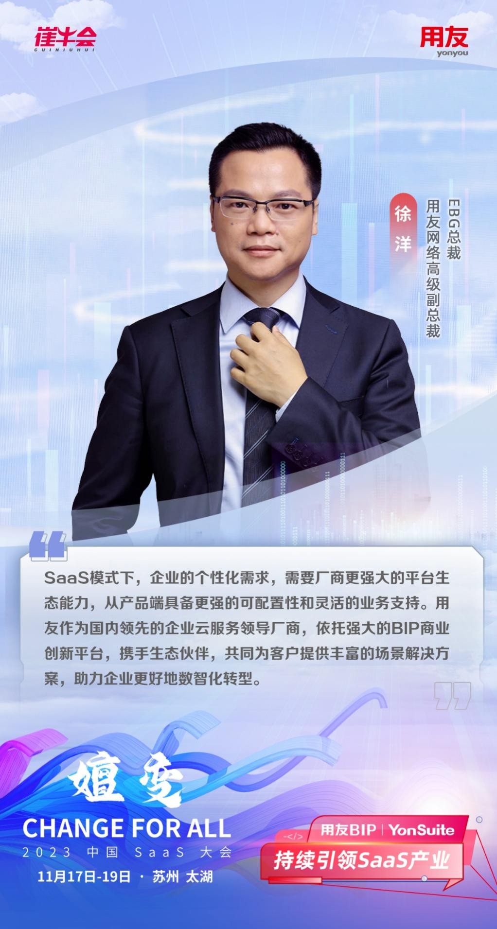 大會(huì)吸引了中國(guó)SaaS行業(yè)的頂尖企業(yè)和重量級(jí)領(lǐng) 袖,圍繞產(chǎn)業(yè)的未來發(fā)展和技術(shù)變革等關(guān)鍵話題進(jìn)行了深入的交流和探討。作為中國(guó)SaaS產(chǎn)業(yè)的領(lǐng) 軍者,用友受到主辦方的盛大邀請(qǐng),用友網(wǎng)絡(luò)董事長(zhǎng)兼CEO王文京、用友網(wǎng)絡(luò)高級(jí)副總裁 EBG總裁徐洋、用友網(wǎng)絡(luò)副總裁 集團(tuán)客戶成功部總經(jīng)理 畢思建、用友網(wǎng)絡(luò)助理總裁 YonSuite營(yíng)銷中心總經(jīng)理 張磊出席了此次盛會(huì),為現(xiàn)場(chǎng)嘉賓帶來寶貴的行業(yè)經(jīng)驗(yàn),同時(shí)也展示了用友在業(yè)界絕對(duì)的領(lǐng)軍地位和持續(xù)創(chuàng)新的能力。