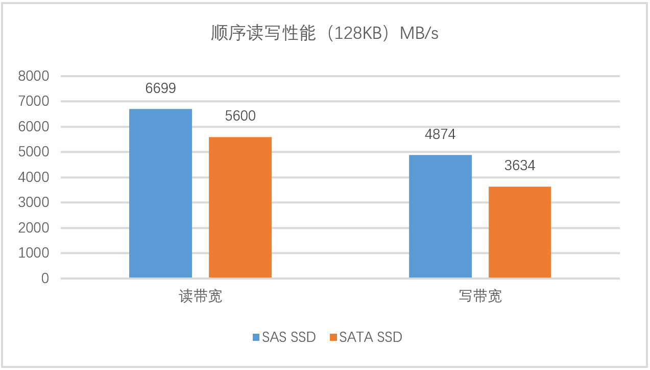 在本次測(cè)試中,將6個(gè)SAS SSD配置Raid5,12塊SATA配置Raid50,在Server主機(jī)使用FIO測(cè)試工具進(jìn)行128KB順序讀寫(xiě)帶寬性能壓測(cè)。從圖3結(jié)果表現(xiàn)可知,SAS SSD讀寫(xiě)帶寬更優(yōu),讀帶寬比SATA有19.6% 左右提升,寫(xiě)帶寬提升34% 左右,展現(xiàn)了SAS SSD在Raid邏輯卷帶寬下的絕對(duì)優(yōu)勢(shì),可為高并發(fā)的業(yè)務(wù)場(chǎng)景提供穩(wěn)定、順暢的數(shù)據(jù)服務(wù)體驗(yàn)。