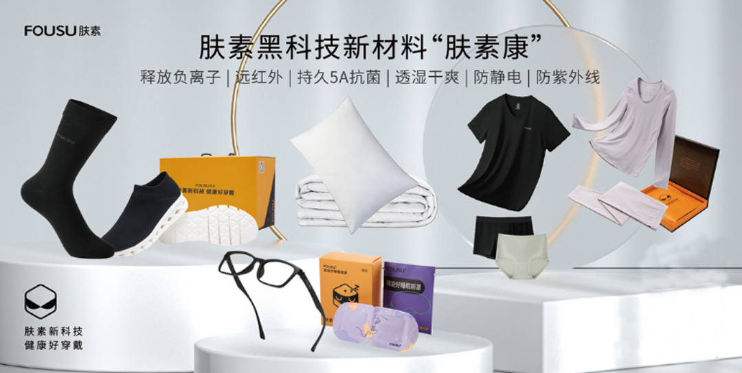 膚素康材料可應(yīng)用于服裝、家紡、鞋帽、眼鏡、防護(hù)衣、配件等不同場景應(yīng)用的產(chǎn)品。采用膚素康材料的產(chǎn)品不僅有多項(xiàng)功能性指標(biāo),而且還具有健康養(yǎng)生的功效。