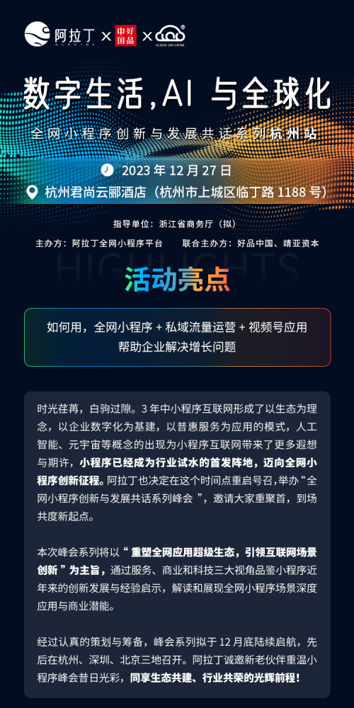 12月27日,阿拉丁在杭州上城區(qū)開啟全網(wǎng)小程序創(chuàng)新與發(fā)展共話系列峰會第 一主題峰會「數(shù)字生活,AI 與全球化」,誠邀您共建小程序生態(tài),解讀行業(yè)前沿、企業(yè)增長,共譜小程序新未來。