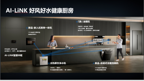 A.O.史密斯精準(zhǔn)捕捉到這一消費(fèi)需求,創(chuàng)新推出“好風(fēng)好水 健康廚房”解決方案。通過(guò)自旋式潔霸洗碗機(jī)、內(nèi)嵌式雙蒸汽蒸烤一體機(jī)兩大新品,協(xié)同「瀞」油煙機(jī)、櫥下冷熱即飲凈水機(jī),在AI-LiNK智慧互聯(lián)平臺(tái)的加持下,構(gòu)建出一個(gè)潔凈、健康、安全的“好風(fēng)好水 健康廚房“。