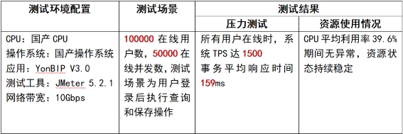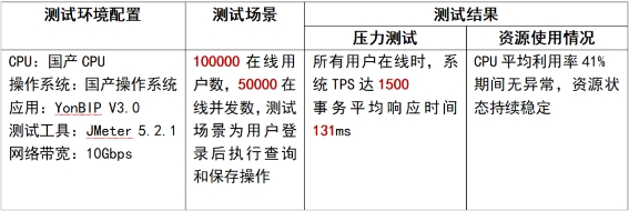 測試報告顯示,在YonBIP3應用下,金倉數(shù)據庫KingbaseES V8和V9性能表現(xiàn)優(yōu)異。100000在線用戶數(shù),50000在線并發(fā)用戶數(shù)的應用場景下,業(yè)務系統(tǒng)的組織建設、權限建立、檔案管理、采購流程、銷售流程、現(xiàn)金管理、固定資產、總賬、賬表查詢等基礎業(yè)務共計幾十項功能全部通過驗證。同時,所有用戶在線時系統(tǒng)TPS值達1500!同比友商在相同環(huán)境下的鑒定結果,在線用戶數(shù)提升3.3倍,在線并發(fā)數(shù)提升5倍,系統(tǒng)TPS提升50%!達到業(yè)界領 先水準!
