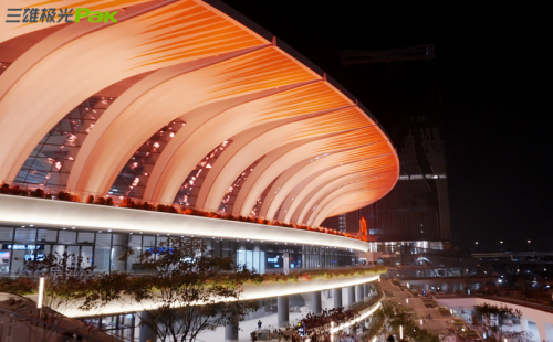 白云站作為高鐵站,在節(jié)日將會迎來巨大的客流量,三雄極光為了給旅客營造濃郁的節(jié)日氛圍,利用全彩投光燈演繹出點光源,線條燈打造動態(tài)效果,打造節(jié)日模式的獨特?zé)艄?,實現(xiàn)建筑夜景宏偉性,又不失燈光趣味性。