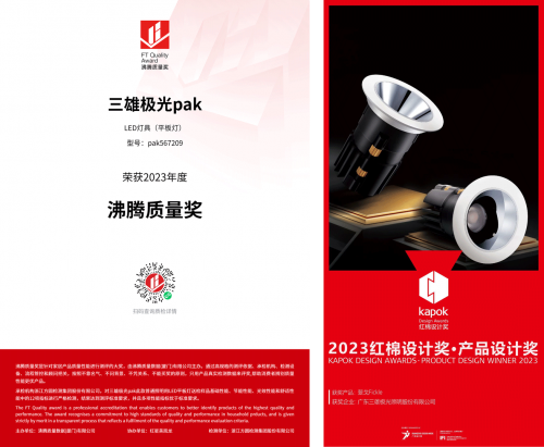 卓越的產(chǎn)品品質(zhì)、穩(wěn)定的產(chǎn)品交付能力及專業(yè)的整體照明方案服務(wù)力是保持行業(yè)領(lǐng)先位置的關(guān)鍵。三雄極光不斷推動(dòng)產(chǎn)品迭代更新,獲得客戶好評的同時(shí)斬獲“沸騰質(zhì)量獎(jiǎng)”、“舒適風(fēng)扇燈獎(jiǎng)”、“2023年度紅棉設(shè)計(jì)獎(jiǎng)·產(chǎn)品設(shè)計(jì)獎(jiǎng)”等榮譽(yù)。嚴(yán)格規(guī)范的生產(chǎn)運(yùn)營管理和質(zhì)量控制體系的優(yōu)勢確保產(chǎn)品品質(zhì)不斷提升,為企業(yè)可持續(xù)發(fā)展奠定更好的基礎(chǔ)。