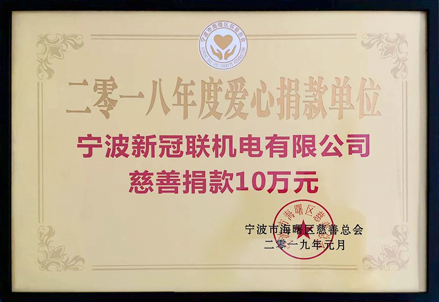 新冠聯(lián)在產(chǎn)品的研發(fā)投入大量的成本,發(fā)展壯大企業(yè)自身的同時(shí),在慈善公益領(lǐng)域也一直默默的踐行著自己的責(zé)任,從2018年起每年向?qū)幉ㄊ泻J飬^(qū)慈善總會(huì)慈善捐款10萬(wàn)元,用于慈善事業(yè)的開(kāi)展。新冠聯(lián)機(jī)電一直秉承著服務(wù)社會(huì),回報(bào)社會(huì)的原則,為社會(huì)的持久穩(wěn)定發(fā)展貢獻(xiàn)自己的一份力量。