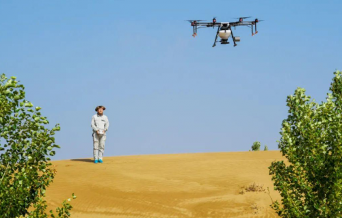 傳統(tǒng)的種樹方式是人們在沙地上挖大坑,然后將苗木栽入其中。然而,這種方式人工成本高,并且容易破壞土壤生態(tài)。在沙漠治理的漫長歷程中,億利資源集團(tuán)不斷探索著更高效、更環(huán)保的方法。隨著科技的飛速發(fā)展,億利資源集團(tuán)引入了無人機(jī)飛播技術(shù),為這一領(lǐng)域帶來了革命性的變化。這種先進(jìn)的技術(shù)利用無人機(jī)將植物種子精準(zhǔn)播撒在需要綠化的區(qū)域,顯著提高了種植效率,為沙漠治理開辟了新的道路。
