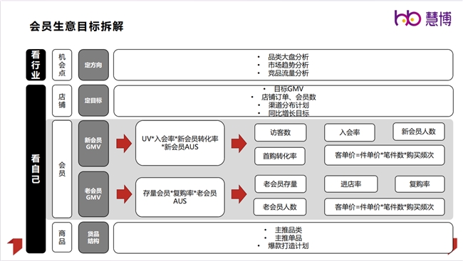 品牌可以根據(jù)品類大盤分析、市場趨勢分析、競品流量分析等作為定方向的依據(jù),更貼合實(shí)際。目標(biāo)則根據(jù)自己店鋪的GMV、會員數(shù)/GMV增長等作為參考。