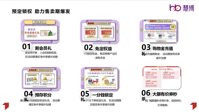 通過預(yù)定鎖權(quán)策略,商家可以提前鎖定一部分消費(fèi)者,確保銷售的穩(wěn)定;在大促預(yù)售期,品牌可以提前通過新會員禮、免定權(quán)益、一分錢鎖定等營銷策略進(jìn)行用戶權(quán)益鎖定。在保證穩(wěn)固部分流量的同時,有效提升用戶的入會率。
