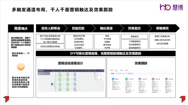 為了高效解決該問題,慧博科技基于多渠道資源整合能力,幫助品牌整合各類可觸達(dá)消費(fèi)者的渠道資源;并通過多波段流程設(shè)計以及活動設(shè)計能力,幫助品牌根據(jù)消費(fèi)者的不同需求和階段,設(shè)計出一系列有針對性的活動,滿足千人千面的消費(fèi)者營銷需求。