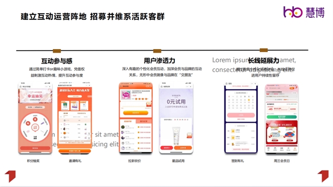 慧博科技提供了豐富的互動營銷玩法模板和創(chuàng)意建議,比如,通過積分抽獎、邀請有禮等簡單的或趣味性的小游戲,有效提升用戶的互動參與感;通過拉新砍價、新品試用等互動玩法有助手加深會員與品牌的互動,提升會員體驗(yàn);簽到有禮、周三會員日,則利于提升會員留存。