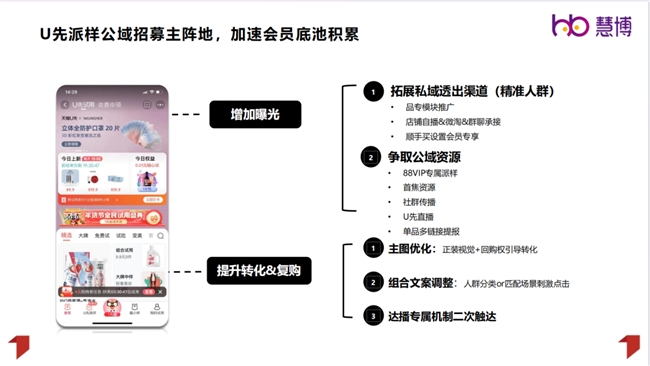 以天貓平臺為例,商家可以有效利用”U先派樣“的公域資源來作為公域招募主陣地,通過在該模塊拓展更多品牌會員權(quán)益來吸引消費(fèi)者關(guān)注品牌,增加曝光;通過基于目標(biāo)人群特性優(yōu)化的主圖+文案,二次刺激消費(fèi)者下單消費(fèi),在消費(fèi)的鏈路中引導(dǎo)入會并沉淀到私域會員池中。