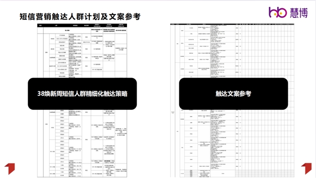 針對每個細(xì)分群體,慧博科技提供了豐富的營銷文案參考,包括活動優(yōu)惠信息、產(chǎn)品推薦、全鏈路關(guān)懷等。品牌商家可以根據(jù)自身需求和目標(biāo),選擇合適的文案進(jìn)行推送,精準(zhǔn)吸引用戶的關(guān)注和興趣。