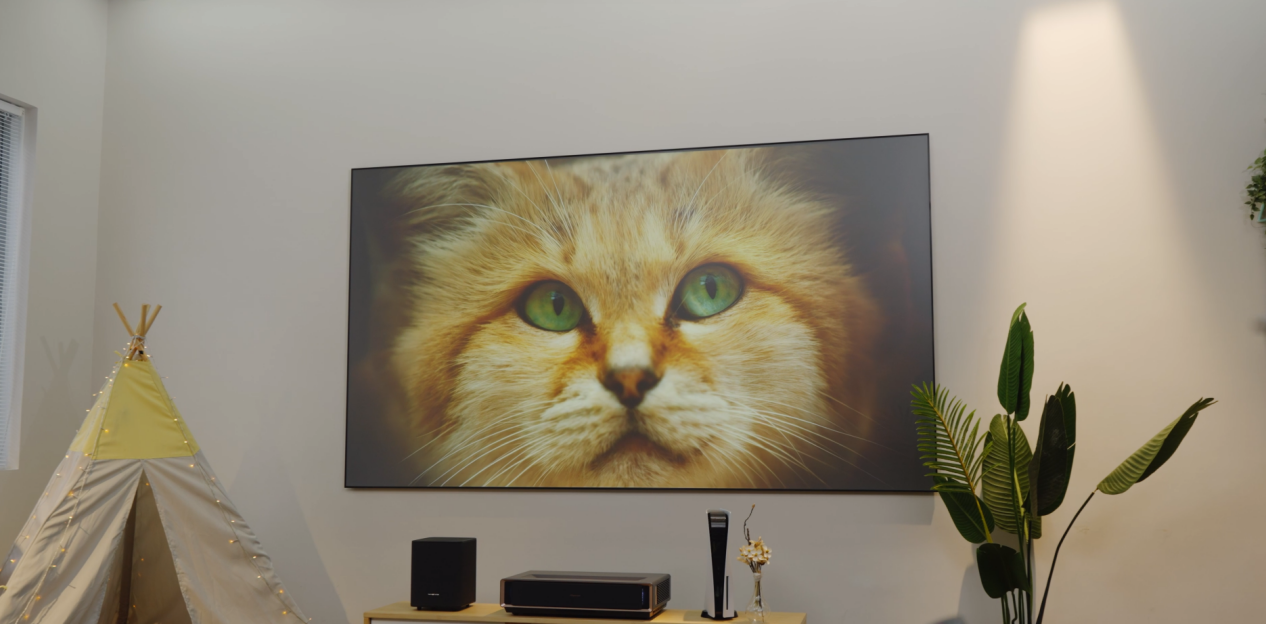 海信激光電視L5K的寬度為1.5米,長度為2.67米,屏幕總面積可以和小浴室的面積相媲美。坐在僅僅4米遠(yuǎn)的距離看這么大的屏幕,無論是玩游戲、看球賽還是看電影,視覺效果都足夠震撼,球員的假動作、或是電影中的小細(xì)節(jié),都能一覽無遺。
