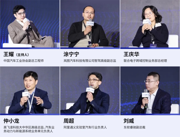 圓桌討論環(huán)節(jié),中國汽車工業(yè)協(xié)會副總工程師王耀,嵐圖汽車科技有限公司智駕高級副總監(jiān)涂寧寧,聯(lián)合電子跨域控制業(yè)務(wù)部總經(jīng)理王慶華,英飛凌科技大中華區(qū)高級總監(jiān)、汽車業(yè)務(wù)動力與新能源系統(tǒng)業(yè)務(wù)單元負責(zé)人仲小龍,阿里通義實驗室汽車行業(yè)負責(zé)人周超,東軟睿馳副總裁劉威共同圍繞“AIDV時代下,汽車軟件的生態(tài)融合與創(chuàng)新突破”主題進行討論,探討AI定義汽車的未來趨勢,并結(jié)合實際案例提出生態(tài)融合的創(chuàng)新路徑,為AIDV 時代生態(tài)協(xié)同發(fā)展提供多元思路與深刻見解。