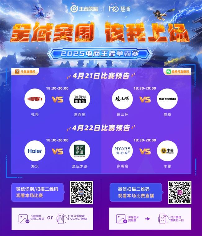 賽事將在 “北京慧博科技” 官方視頻號(hào)、斗魚(yú)號(hào)同步直播,掃描下方二維碼立即預(yù)約觀賽,精彩對(duì)決不容錯(cuò)過(guò)!4 月 21 日 18:30,我們不見(jiàn)不散,共同見(jiàn)證電商王者的誕生!