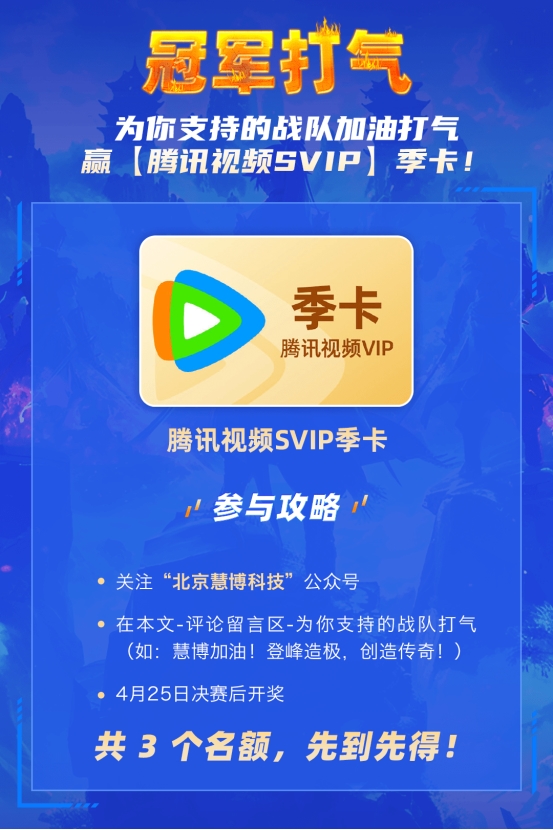 現(xiàn)在,只需在本文評(píng)論區(qū)留言為你支持的戰(zhàn)隊(duì)加油打氣,(如:慧博加油!登峰造極,創(chuàng)造傳奇!),最具創(chuàng)意并獲贊最多的三位評(píng)論者將獲得【騰訊視頻平臺(tái)SVIP季卡】一張(共 3 個(gè)名額)!