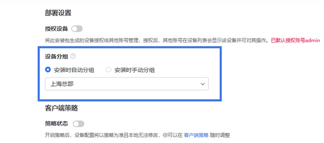 如果我們選擇了自動(dòng)分組,該定制包在安裝部署的時(shí)候,會(huì)自動(dòng)加入設(shè)置好的分組中。這一策略下,我們實(shí)現(xiàn)復(fù)雜分組,就需要按照需要的組別的數(shù)量,每個(gè)組定制對應(yīng)的安裝包即可。該功能還支持我們設(shè)置具體的自動(dòng)分組策略,當(dāng)系統(tǒng)檢測到設(shè)備名稱/備注名是否包含指定的關(guān)鍵詞,就會(huì)自動(dòng)分配到指定的分組。