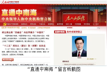 “直通中南海——中央領(lǐng)導(dǎo)人和中央機構(gòu)留言板”以“中南海新華門”和“為人民服務(wù)”影壁動畫頁面為封面,網(wǎng)友點擊進入留言板首頁就可以給中央領(lǐng)導(dǎo)人和中央機構(gòu)留言。留言板右側(cè)是中央政治局9位常委的照片,照片下有領(lǐng)導(dǎo)人的最新動態(tài)新聞和“點擊留言”按鈕。網(wǎng)友留言可以個人的“網(wǎng)友”身份,也可以“黨組織”或單位名義。此外在中央政治局委員及書記處書記的名字一側(cè)也有留言按鈕,網(wǎng)友點擊即可進入留言頁面。在同一個頁面,網(wǎng)友還可以給各中央機構(gòu)留言,包括中紀委、組織部、宣傳部、政法委等機構(gòu)在內(nèi),網(wǎng)友均可以點擊進入。