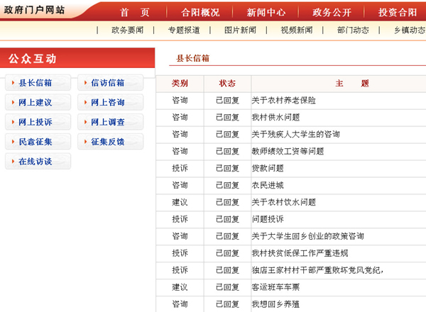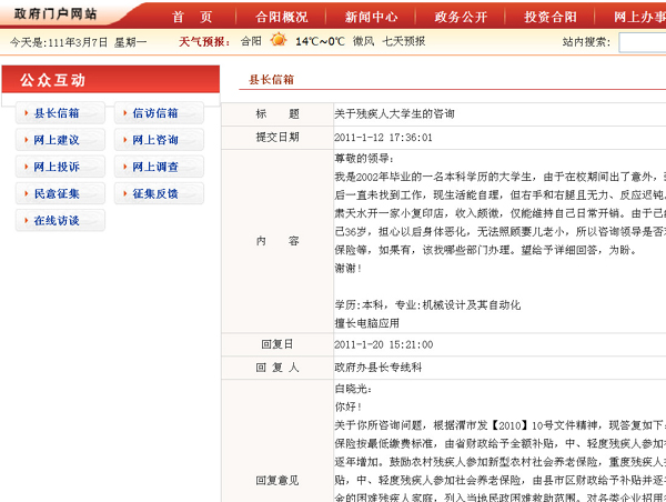 這是合陽(yáng)縣政府網(wǎng)站“縣長(zhǎng)信箱”內(nèi)的一條留言與回復(fù)(網(wǎng)絡(luò)截圖)。陜西一個(gè)原本不起眼的小縣城合陽(yáng)目前已成為網(wǎng)上網(wǎng)下熱點(diǎn),這個(gè)縣的政府網(wǎng)站由于對(duì)網(wǎng)民的咨詢和投訴件件有回復(fù),被網(wǎng)民稱作“最敬業(yè)的縣政府網(wǎng)站”。由于去“圍觀”頂起的網(wǎng)民太多,一度導(dǎo)致這個(gè)縣政府網(wǎng)站“癱瘓”?!白罹礃I(yè)的縣政府網(wǎng)站”為何被頂起?一直在關(guān)注兩會(huì)進(jìn)程的網(wǎng)民說:因?yàn)樗鹬鼐W(wǎng)民意見,不擺空架子不作秀,事事有回應(yīng)。參加兩會(huì)的不少代表委員也指出,合陽(yáng)縣的經(jīng)驗(yàn)表明,網(wǎng)絡(luò)問政必須由原來的網(wǎng)民單向表達(dá)變成政府與網(wǎng)民的雙向互動(dòng),“網(wǎng)民有所呼,政府有所應(yīng)”才能見到實(shí)效,才能得到群眾的擁護(hù)。