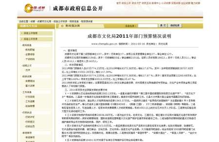 在政府網(wǎng)站所列的61個市級部門中,有49個部門“財政預(yù)算”欄中顯示“暫時沒有信息”,而成都市科技局、財政局、文化局等12個部門已經(jīng)公布了2011年預(yù)算情況,另外公布的還有人力資源和社會保障局、農(nóng)委、環(huán)保局、國土資源局、規(guī)劃管理局、廣播電視和新聞出版局、工商局、城鄉(xiāng)房產(chǎn)管理局、投資促進委員會。