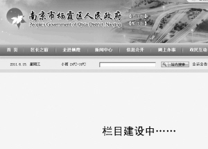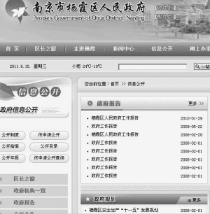 根據(jù)張先生的指引,記者打開了南京市棲霞區(qū)人民政府的網(wǎng)站,網(wǎng)站首頁上設(shè)計了“區(qū)長之窗”“走進棲霞”“新聞中心”“信息公開”“網(wǎng)上辦事”“政民互動”“投資棲霞”“便民服務(wù)”等子板塊。