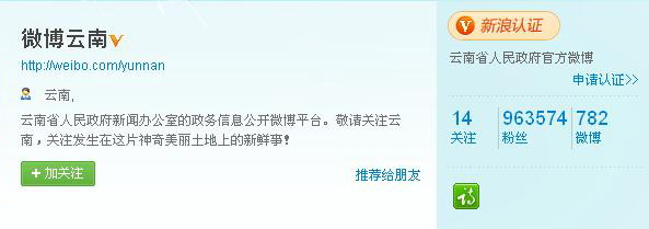 “云南省人民政府新聞辦公室的政務(wù)信息公開微博平臺。敬請關(guān)注云南,關(guān)注發(fā)生在這片神奇美麗土地上的新鮮事!”這是云南省人民政府官方微博上的簡介。