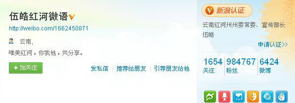 據(jù)不完全統(tǒng)計,云南宣傳部門率先開通微博,除了省政府新聞辦官方“微博云南”之外(目前粉絲約200萬)16個的州市中有10個外宣辦開通了官方微博;129個縣級宣傳部門有一半的縣委宣傳部已開通了官方微博。云南官員個人微博也發(fā)展迅猛。紅河州委宣傳部長伍皓、曲靖市委宣傳部長何華、西雙版納州委外宣辦主任段金華、麗江市委外宣辦主任張文銀、迪慶州委外宣辦主任李映懷等,及省委外宣辦網(wǎng)絡(luò)處長李翔昌等一批領(lǐng)導(dǎo)干部開通了個人微博。通過網(wǎng)上互動引導(dǎo)輿論,取得良好效果。