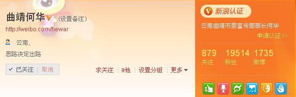 曲靖市委宣傳部長何華,雖然沒有那么高的人氣,但比起“博齡”他甚至比伍皓還多一個月。“希望小小的微博不僅僅成為大家了解曲靖各地的一扇窗口,更成為各地了解網(wǎng)絡(luò)輿情、推進(jìn)政務(wù)公開、促進(jìn)政民互動的良好平臺。”這是何華對微博平臺的個人理解。