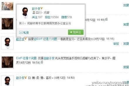 4月11日,名為“EorF-這是個(gè)問題”的博友在微博中曬了一張“波濤洶涌”的圖片,自稱“紀(jì)念粉絲破200,上新”,4月12日14:50分,加V認(rèn)證為“成都青羊區(qū)教育局黨委辦公室主任”的“趙子俊”對(duì)此發(fā)表評(píng)論:“白、嫩、柔滑,喜歡”。隨后“EorF-這是個(gè)問題”答道:“光從視覺就連手感和口感都yy出來(lái)了,有水平,握爪”,“趙子俊”立刻回到:“一看就是寶貝,還沒來(lái)得及yy。”幾分鐘后,“EorF-這是個(gè)問題”提醒對(duì)方:“加v的官勃呀,表亂看哦”