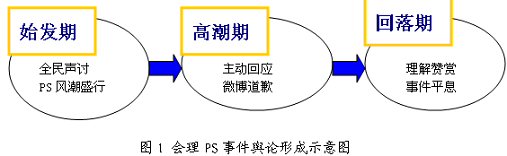 根據(jù)媒體報(bào)道的情況,會理事件的輿論形成過程基本上分為三個階段:在始發(fā)期階段,全民聲討,PS狂潮盛行;第二階段為高潮期,會理政府主動回應(yīng)、微博道歉;回落期階段,網(wǎng)友對會理政府的做法表示理解贊賞,事件平息。(見圖1)