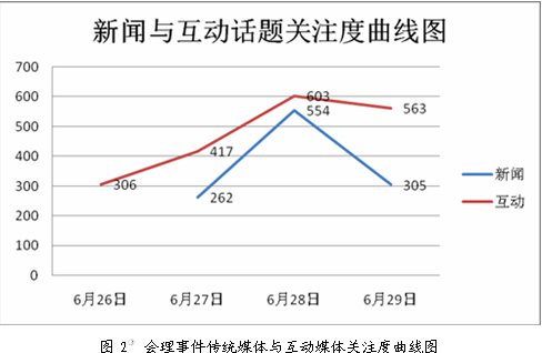 根據(jù)人民網(wǎng)輿情監(jiān)測室的分析數(shù)據(jù),6月28日,該事件在互動新聞和傳統(tǒng)報(bào)道中均達(dá)到了高潮,6月29日之后有所回落。并且,該事件在互動新聞方面呈現(xiàn)著“先知先覺”“持續(xù)高溫”的輿情態(tài)勢。根據(jù)人民網(wǎng)輿情監(jiān)測室的分析數(shù)據(jù)(見圖2),6月28日,該事件在互動新聞和傳統(tǒng)報(bào)道中均達(dá)到了高潮,6月29日之后有所回落。同時,從曲線圖中可以看出,該事件在互動新聞方面一直呈現(xiàn)著“先知先覺”“持續(xù)高溫”的輿情態(tài)勢。