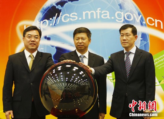 圖為外交部副部長(zhǎng)宋濤與領(lǐng)事司司長(zhǎng)黃屏、副司長(zhǎng)郭少春出席開(kāi)通儀式